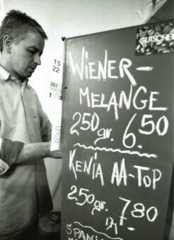 »Neben Süd-und Lateinamerika sind auch Indien oder Kenia für erstklassige Rohprodukte gut«, ergänzt Herr Schulz. Zu seinem Leidwesen kommt aber zunehmend Ware aus Vietnam auf den Markt. »Mehr Masse ars Klasse«, urteilt. er. Er selbst bezieht seine Rohbohnen nicht über die Börse sondern über Agenten vor Ort. Und die kaufen auch bei Kooperativen, einem Zusammenshluss kleinerer Anbauern. Auch auf die zunehmende Nachfrage nach Bio Produkten reagiert er seit Längerem. Fair Trade-Produkte führen auch bei ihm kein Schattendasein, wie der Blickfang gleich neben der Kasse Zeigt. Vor dem gewaltigen Einbruch in den 80er-jahren gab es für die Bohnen zumindest in Deutschland wesentlich mehr Adressen.